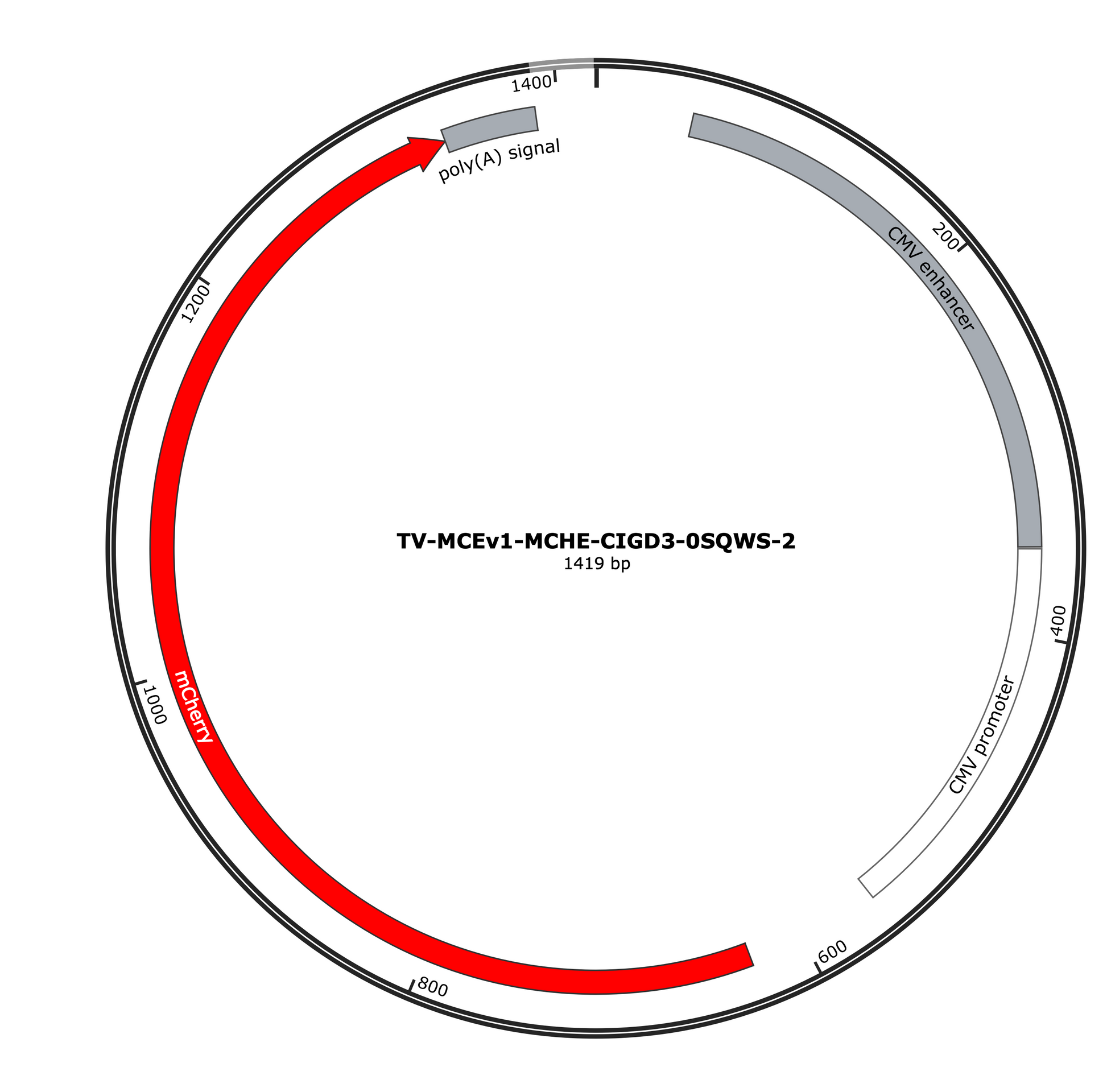 TrueVector-CMV-mCherry (AmpR, High Copy) is a high-yield plasmid engineered for strong transient expression of mCherry in mammalian cells using a promoter derived from the CMV promoter. This plasmid can be used as a control in transfection experiments of plasmids expressing your gene of interest.